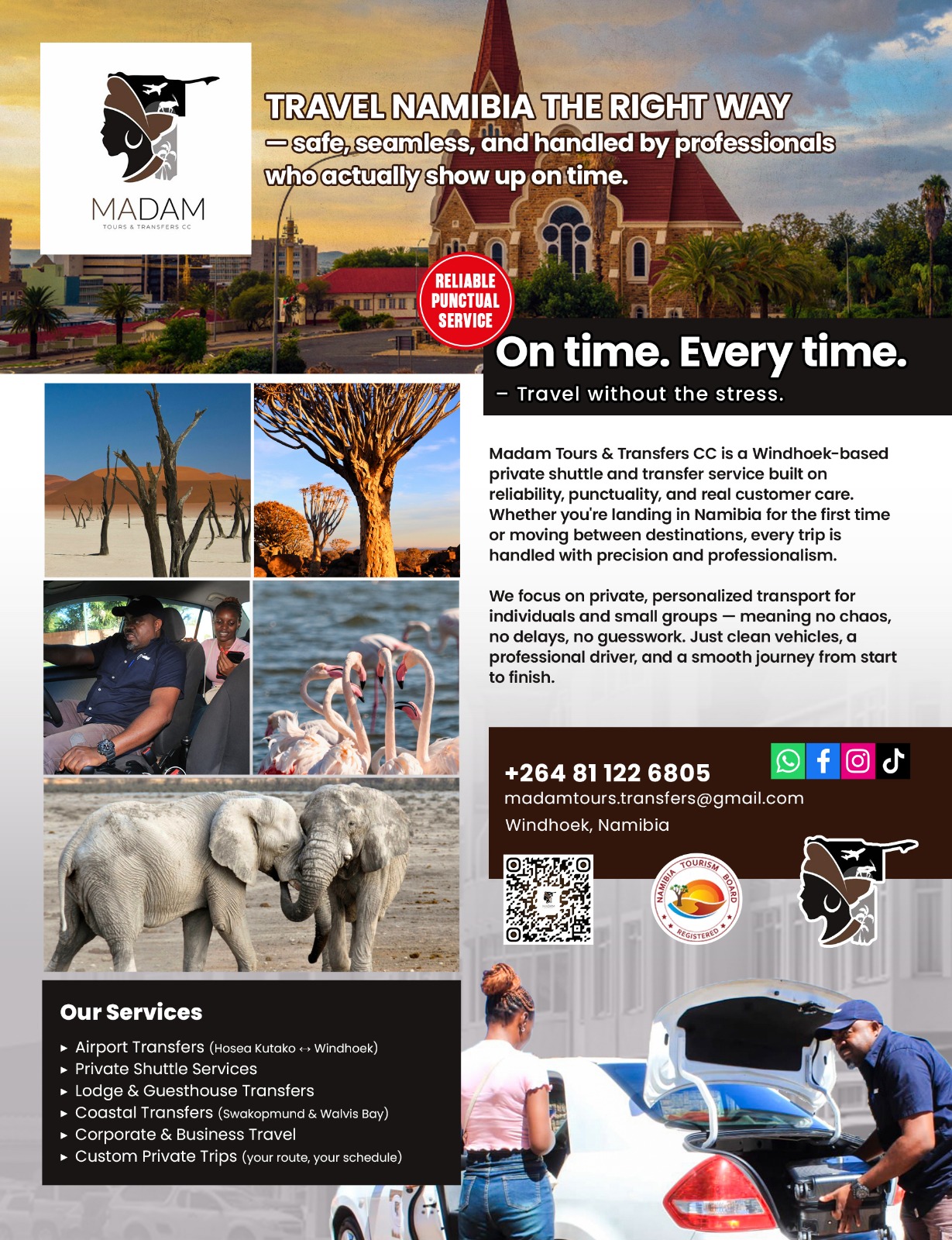 At Madam Tours & Transfers CC, we don’t just provide transport — we deliver a seamless travel experience. From airport pickups to scenic journeys across Namibia, we are here to ensure your trip is comfortable, safe, and memorable every step of the way.