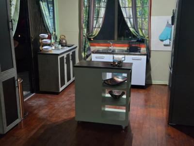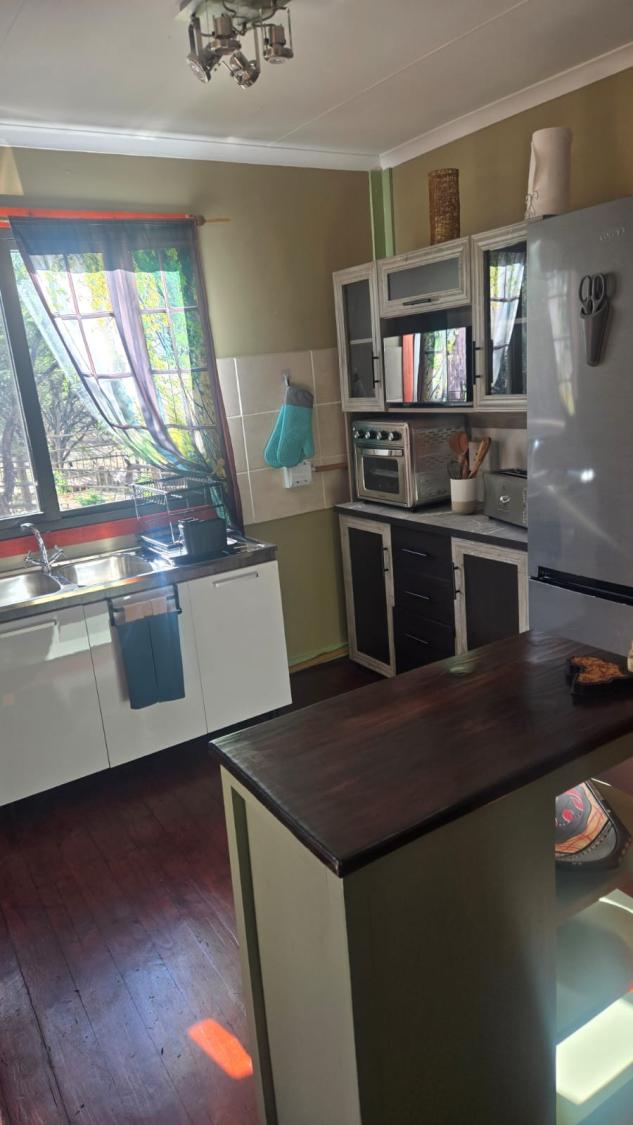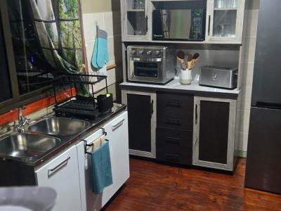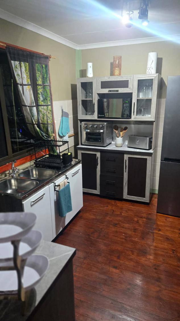 The open-plan kitchen is fully equipped with modern appliances, including an air-fryer, microwave, fridge-freezer, toaster, and a conventional plate stove. Cutlery and crockery are provided, allowing guests to prepare and enjoy meals with ease.