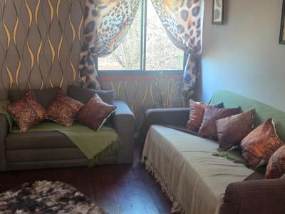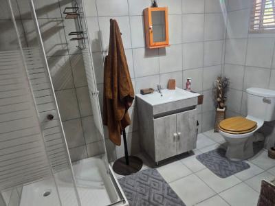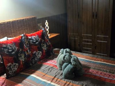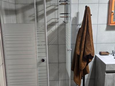 The wooden cabin comprises two furnished bedrooms, each equipped with air conditioning to ensure a pleasant stay in any season. Guests share a modern bathroom fitted with a shower and toilet. The lounge area features a sleeper couch and sofa for extra sleeping arrangements, as well as a TV for entertainment and relaxation.