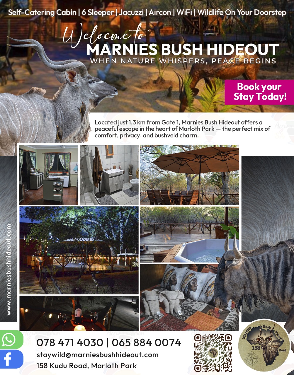 Located just 1.3km from Gate 1 in the heart of Marloth Park, Marnies Bush Hideout offers guests comfortable, self-catering accommodation designed to provide both privacy and relaxation. This is the ideal destination for those seeking to leave behind the commercialised pace of everyday life and immerse themselves in the serenity of the bushveld, while still enjoying touches of luxury.