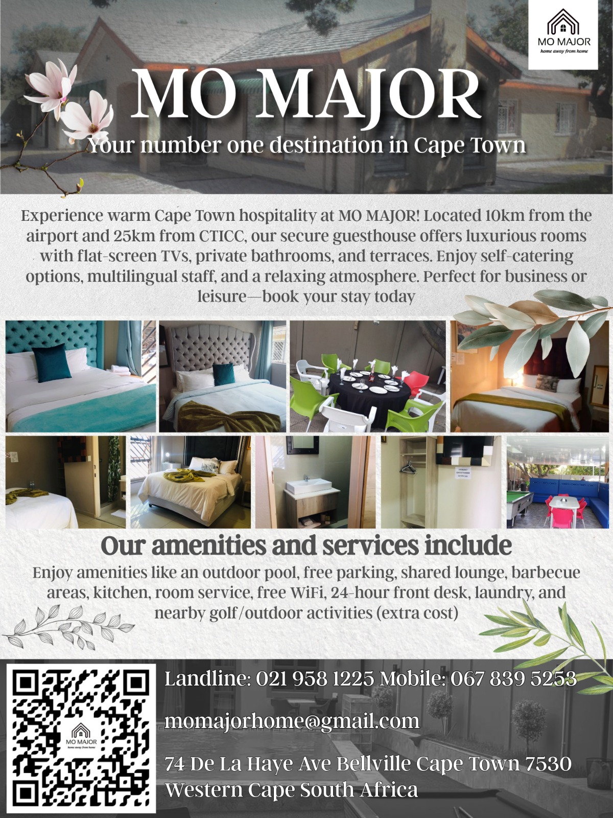 At MO MAJOR, we're passionate about creating a warm and welcoming atmosphere that makes our guests feel right at home. Our property is situated in a quiet and secure area, just 25 km from the Cape Town International Convention Centre (CTICC) and 10 km from Cape Town International Airport.