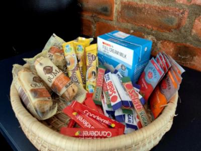 The kitchen is fitted with a 2-plate gas stove, a kettle, an air fryer, a microwave, a fridge, cutlery, and crockery.