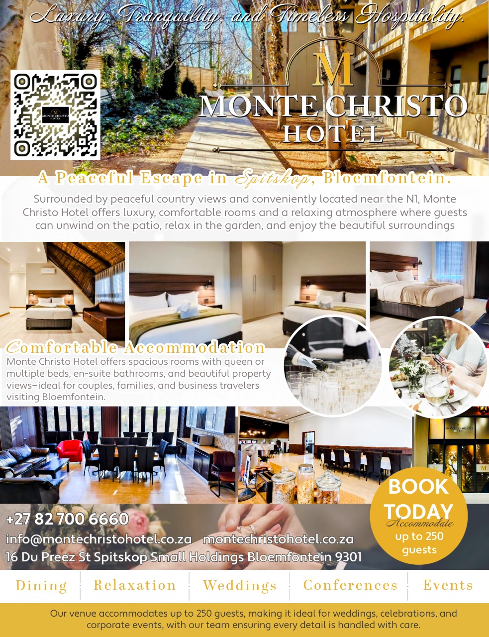 Welcome to Monte Christo Hotel, a hidden treasure on the western outskirts of Bloemfontein in the peaceful area of Spitskop.