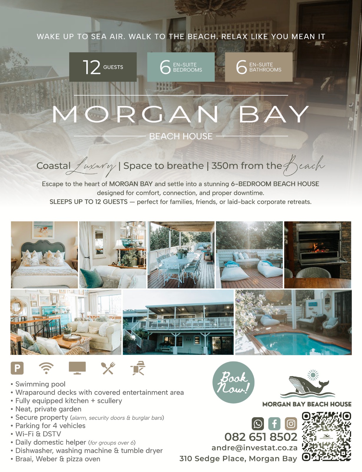 Located in the picturesque Morgan Bay, Morgan bay Beach House is a stunning 6-bedroom house 350m form the beach that offers the perfect blend of comfort, relaxation, and adventure. Our beautifully appointed home is designed to accommodate up to 12 guests, making it an ideal choice for families, groups of friends, and corporate retreats.