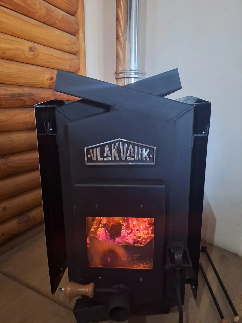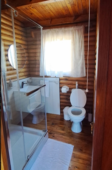 This charming wooden cabin features a steep staircase leading to the chalet. The cabin is designed in an open-plan style, with the exception of an enclosed bathroom. On the loft, accessed by a ladder, there are two single beds, while the main level has a double bed. (Please note that the loft is not suitable for small children or elderly individuals.)