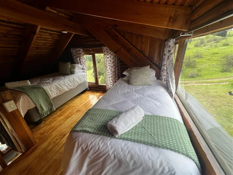 This is an open-plan wooden cabin with a steep staircase leading to the chalet. The loft features two single beds (accessible by ladder), while the main level offers a double bed. Please be aware that the loft is not suitable for small children or elderly individuals.