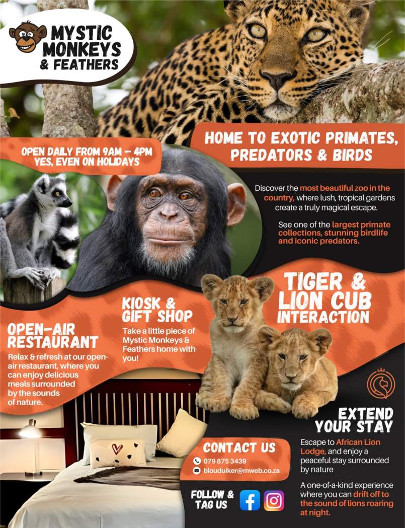Mystic Monkeys & Feathers Wildlife Park is an ideal venue for school tours, catering for students from Grade 1 to 12 as well as pre-scholars. Our park offers a unique and interactive learning experience, allowing students to get up close and personal with our amazing animals.