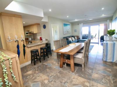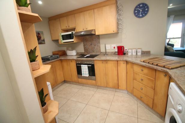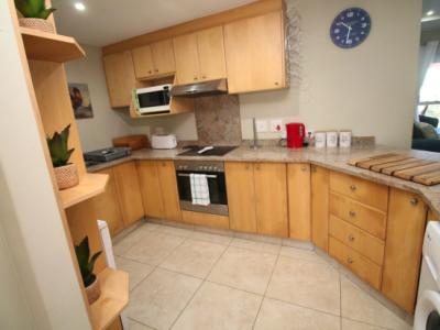 The open-plan kitchen is equipped with a fridge-freezer, stove, oven, toaster, microwave, dishwasher, washing machine, basic cutlery and crockery, as well as tea- and coffee-making facilities.