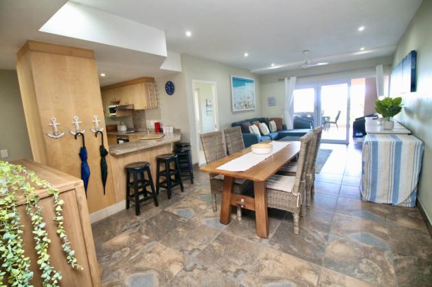 There’s a dining table with chairs and the living area is furnished with a lounge suite and a flat-screen TV installed with DStv.