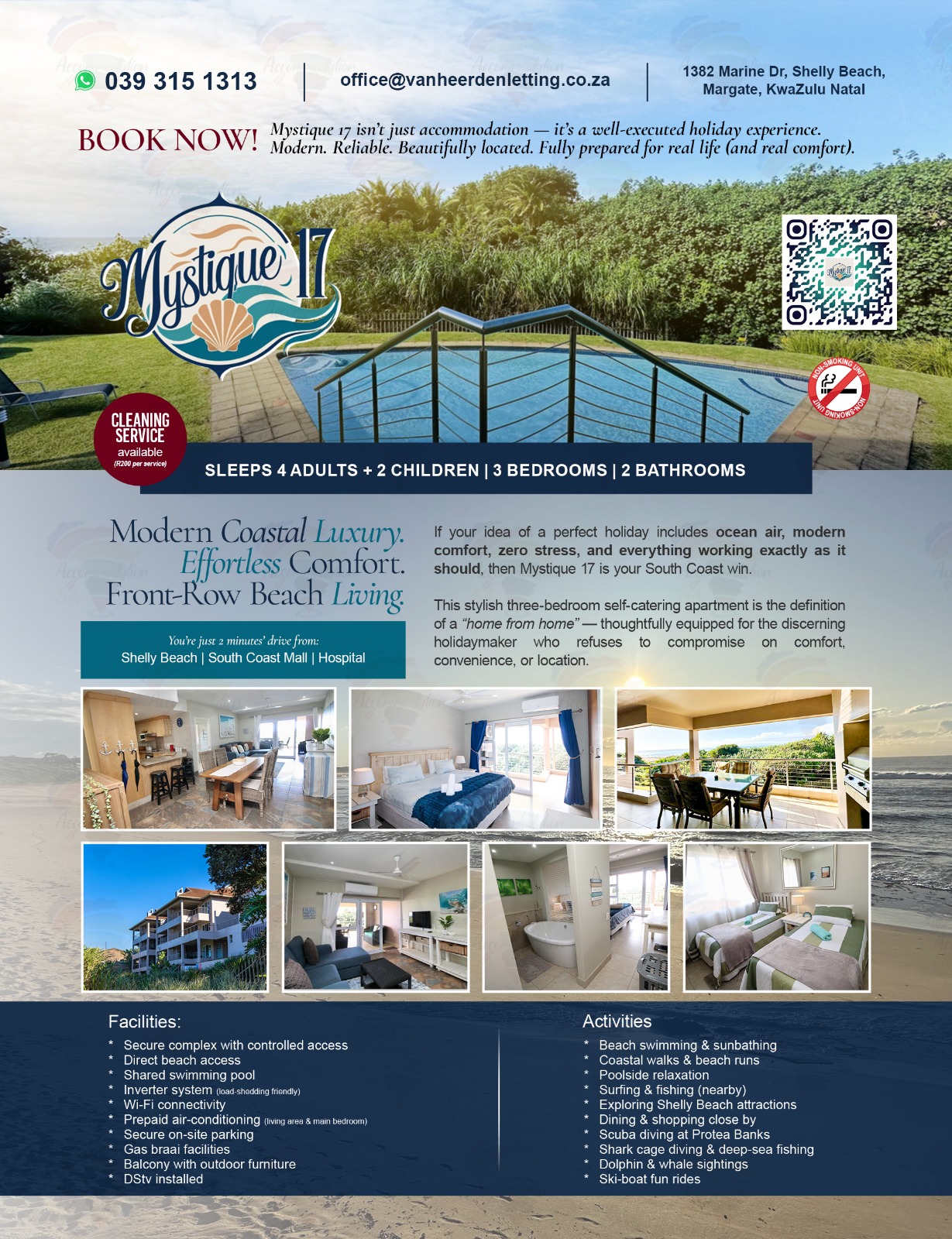 Mystique 17 is a self-catering apartment situated on the first floor of a secure complex in Shelly Beach, on the South Coast. Perfectly positioned to take a dip in the ocean before relaxing on the beach or a swim in the sparkling complex pool, this apartment is ideal for holidaymakers alike.