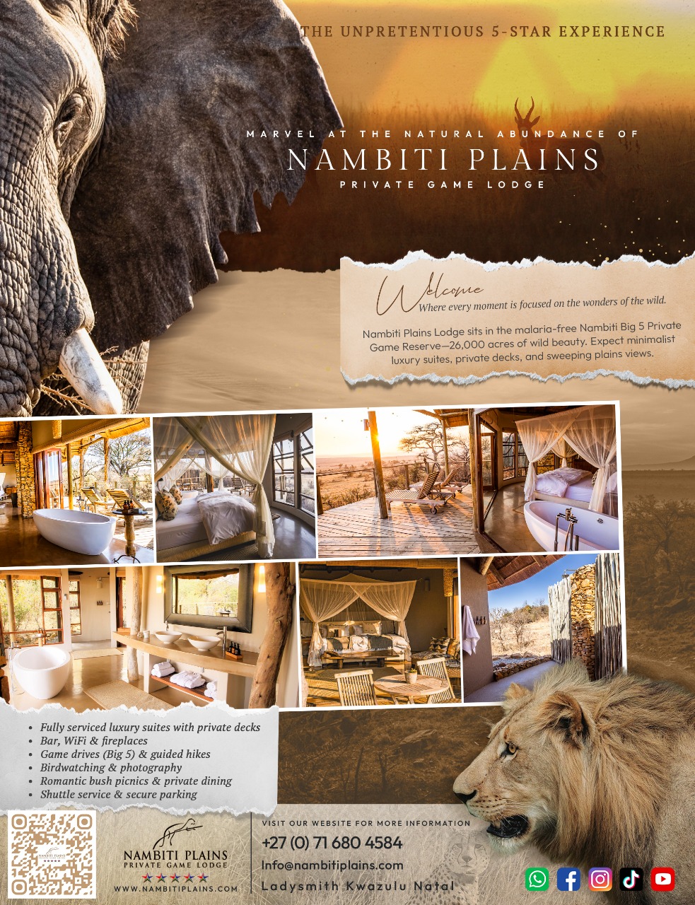 Nambiti Plains Private Game Lodge is a haven of luxury and tranquility, nestled in the heart of the 26,000-acre Nambiti Big 5 Private Game Reserve.