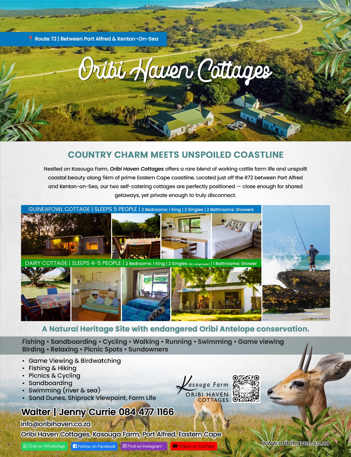 - Experience the peace and tranquillity of farm life, together with the splendour of the bountiful game that roam our area and at the same time enjoy your secluded beach