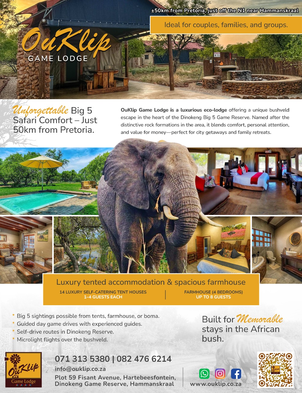 OuKlip Game Lodge is a luxurious eco-lodge situated in the malaria-free Dinokeng Big 5 Game Reserve, covering an area of 18,500ha.