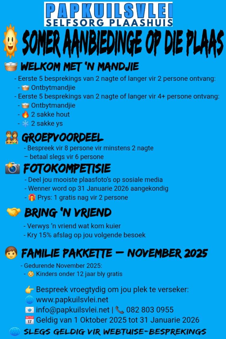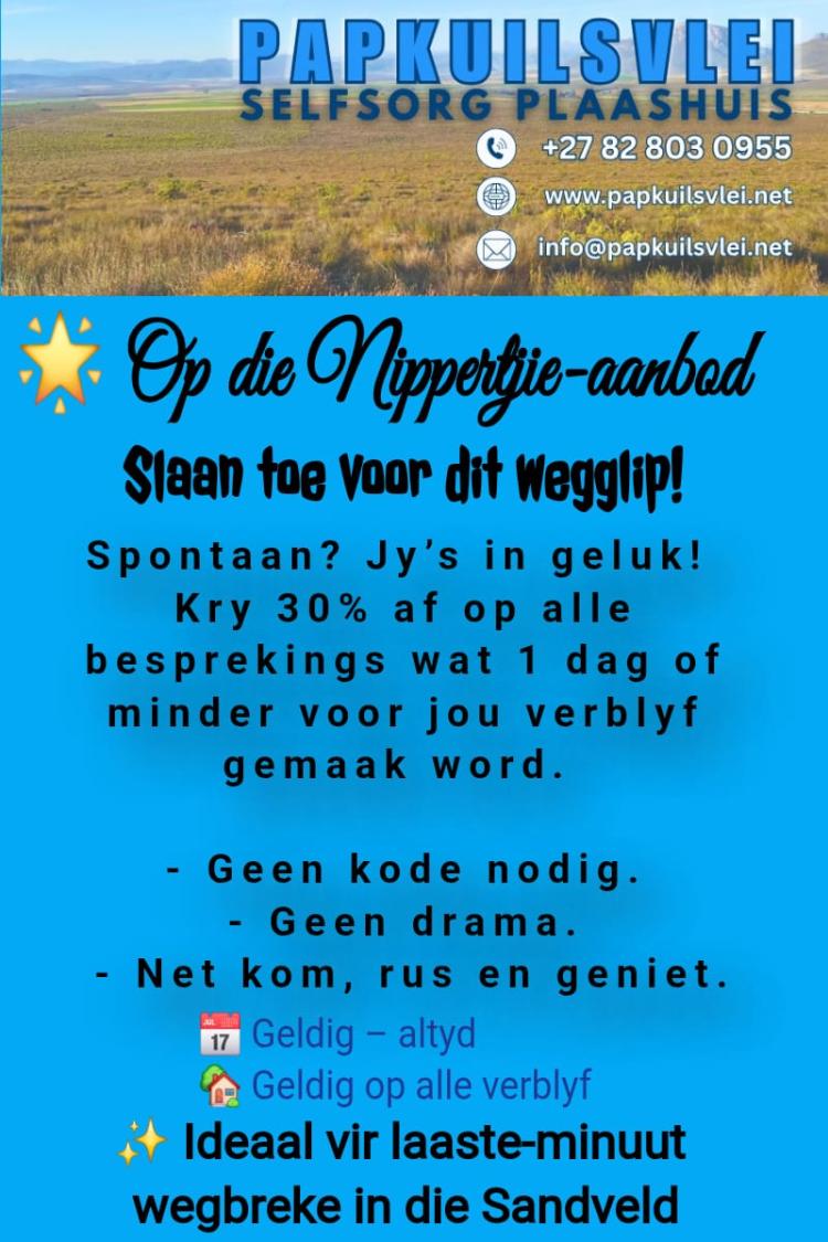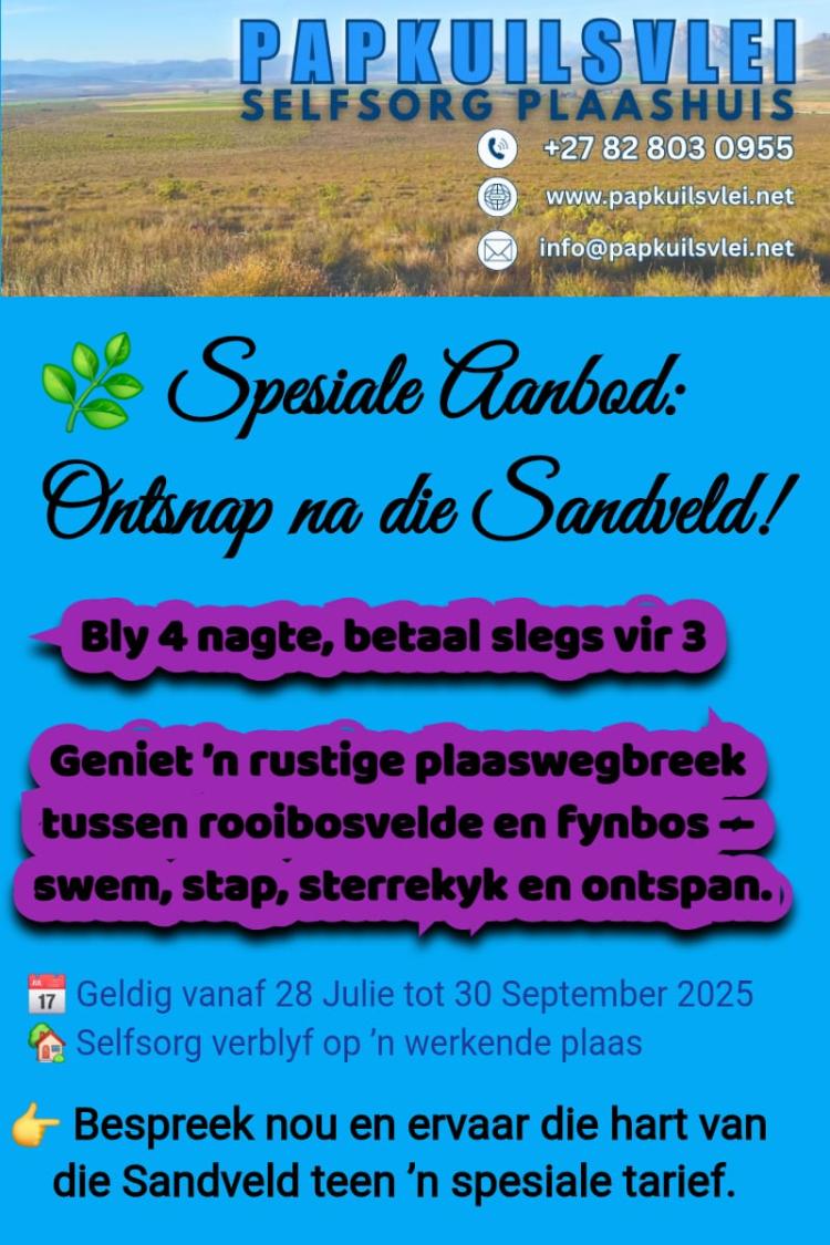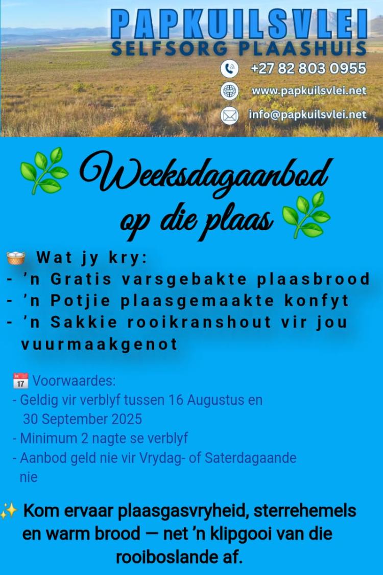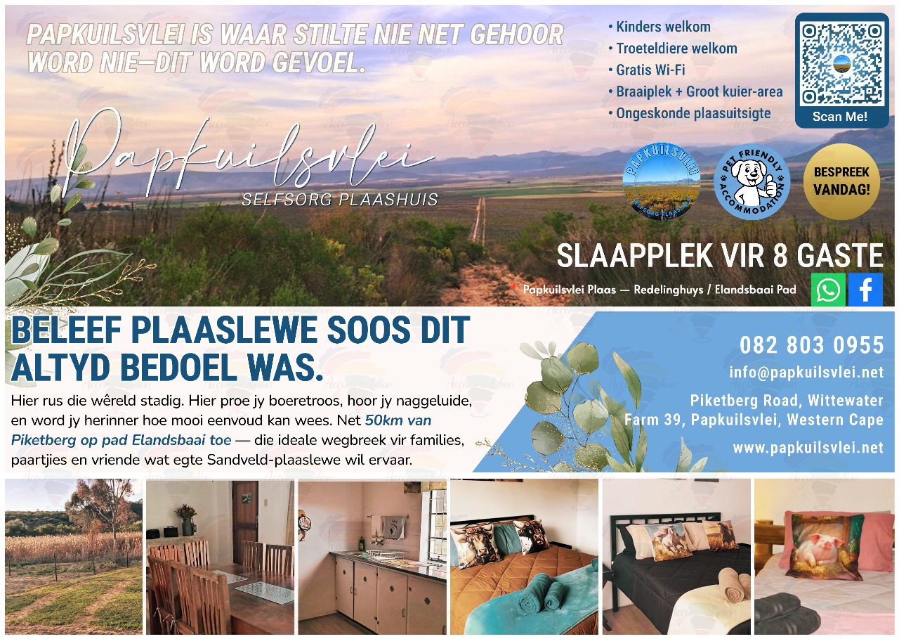 Kom rus jou siel waar stilte, natuur en warmte saamvloei. Net 50km buite Piketberg, rigting Elandsbaai, wag Papkuilsvlei – ’n plek waar plaaslewe jou rustig en opreg verwelkom.