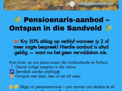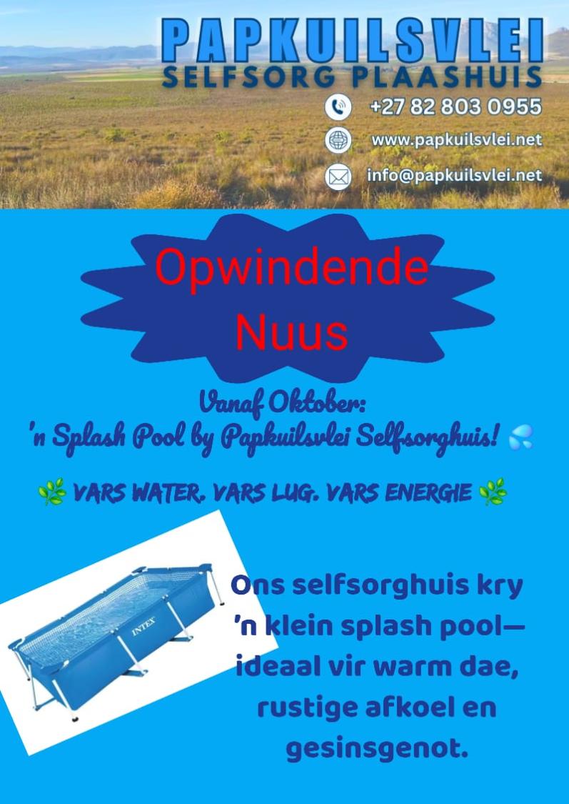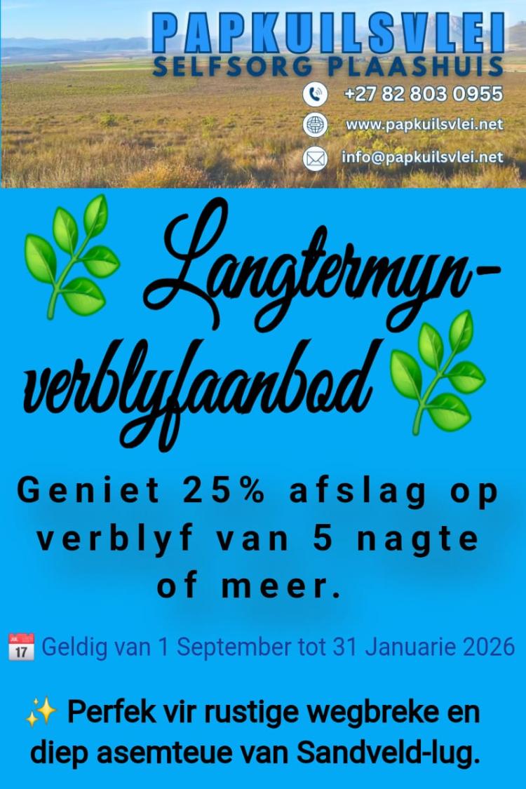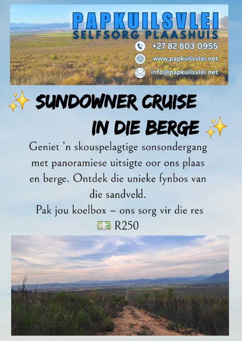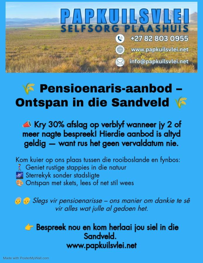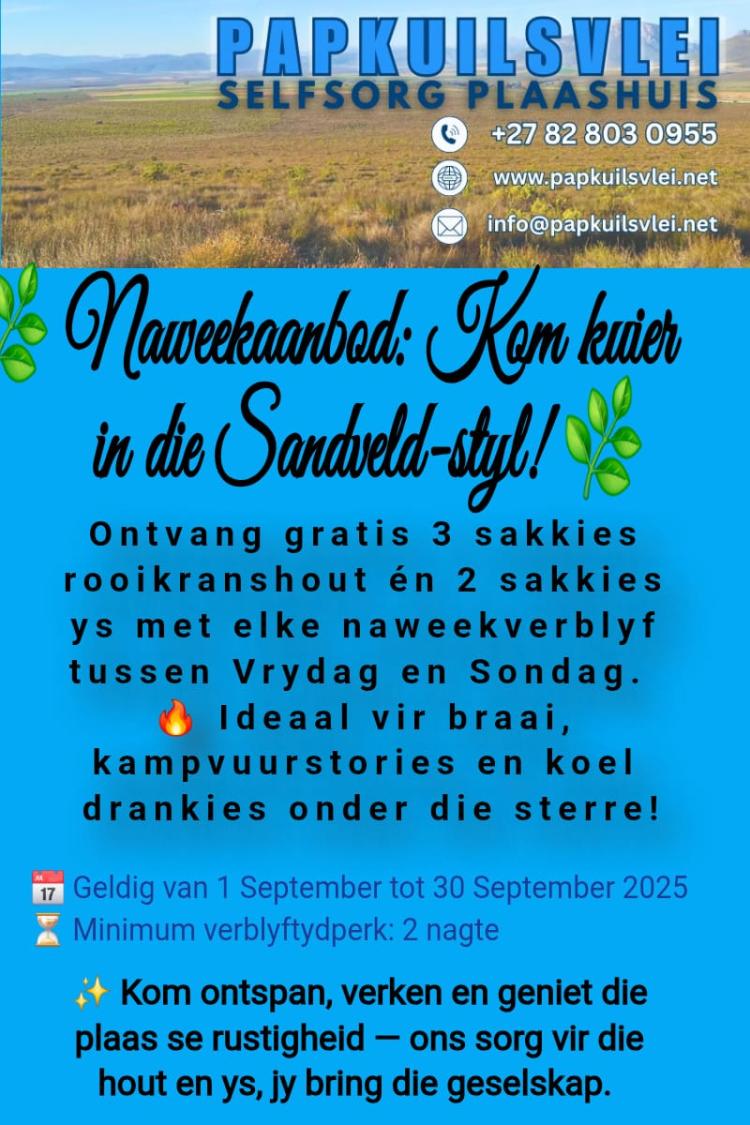 Kom rus jou siel waar stilte, natuur en warmte saamvloei. Net 50km buite Piketberg, rigting Elandsbaai, wag Papkuilsvlei – ’n plek waar plaaslewe jou rustig en opreg verwelkom.