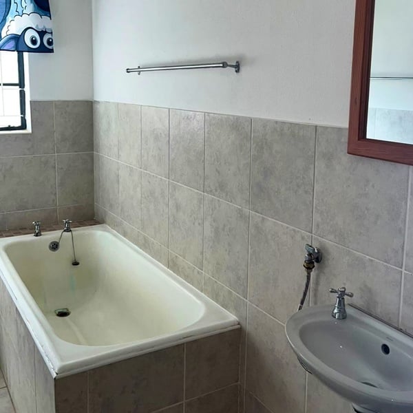 Gerieflike groot badkamer met wasbak, bad, toilet en stort.