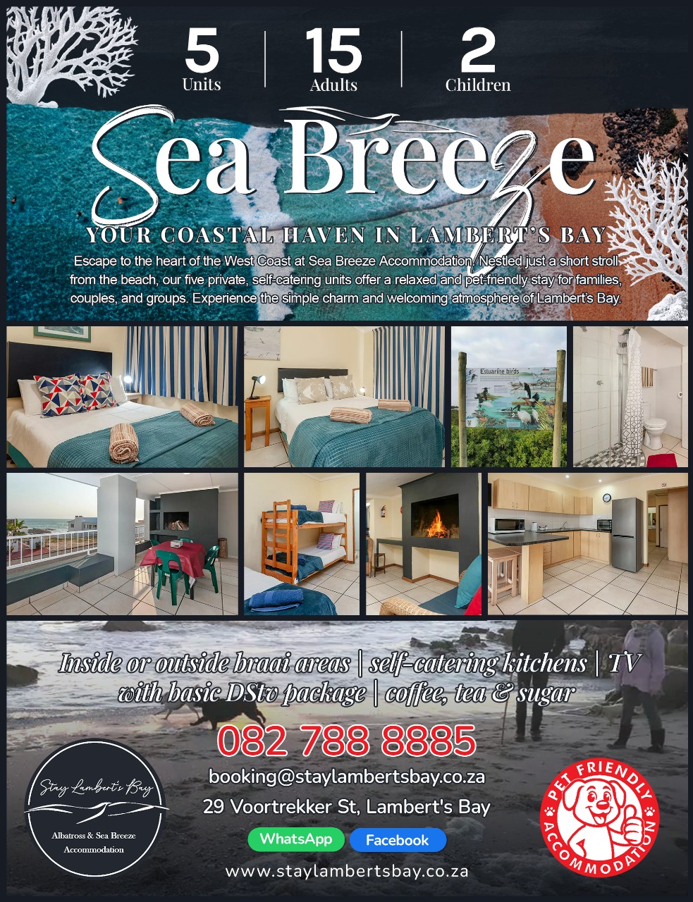 Welcome to Sea Breeze Accommodation, a cozy and convenient place to stay in Lambert's Bay. Our five separate, private units are just around the corner from the beach and can accommodate a total of 19 adults and two children.