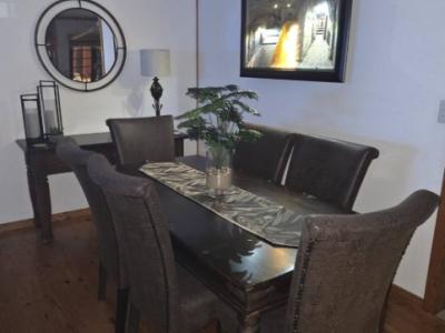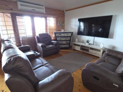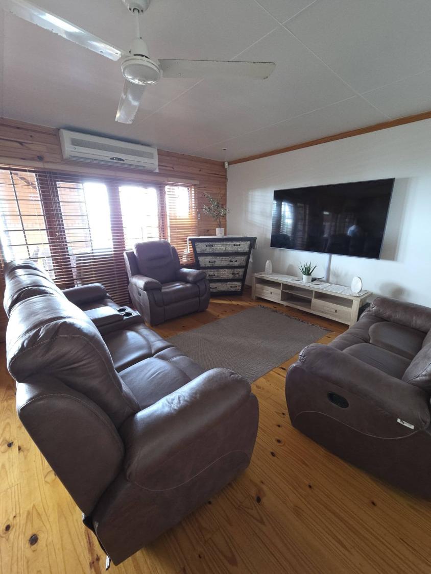 The open-plan lounge and dining area is designed for comfort, featuring cozy seating, a spacious dining table, and a 75-inch Smart TV with free fibre Wi-Fi—perfect for relaxing after a day at the beach.