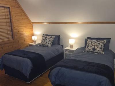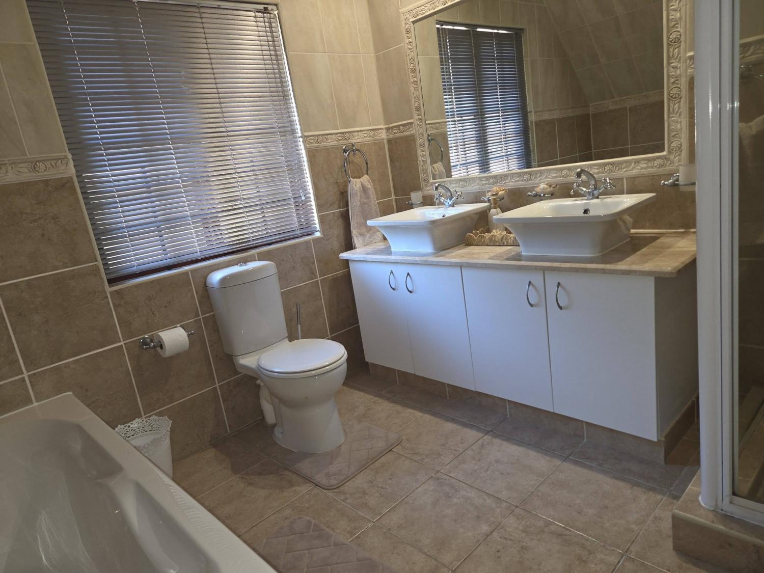 The main bedroom offers a queen-size bed with a private en-suite bathroom fitted with a bath, shower, and double basins. The second bedroom also includes a queen-size bed, while the third bedroom has two single beds and shares a second bathroom with a shower.