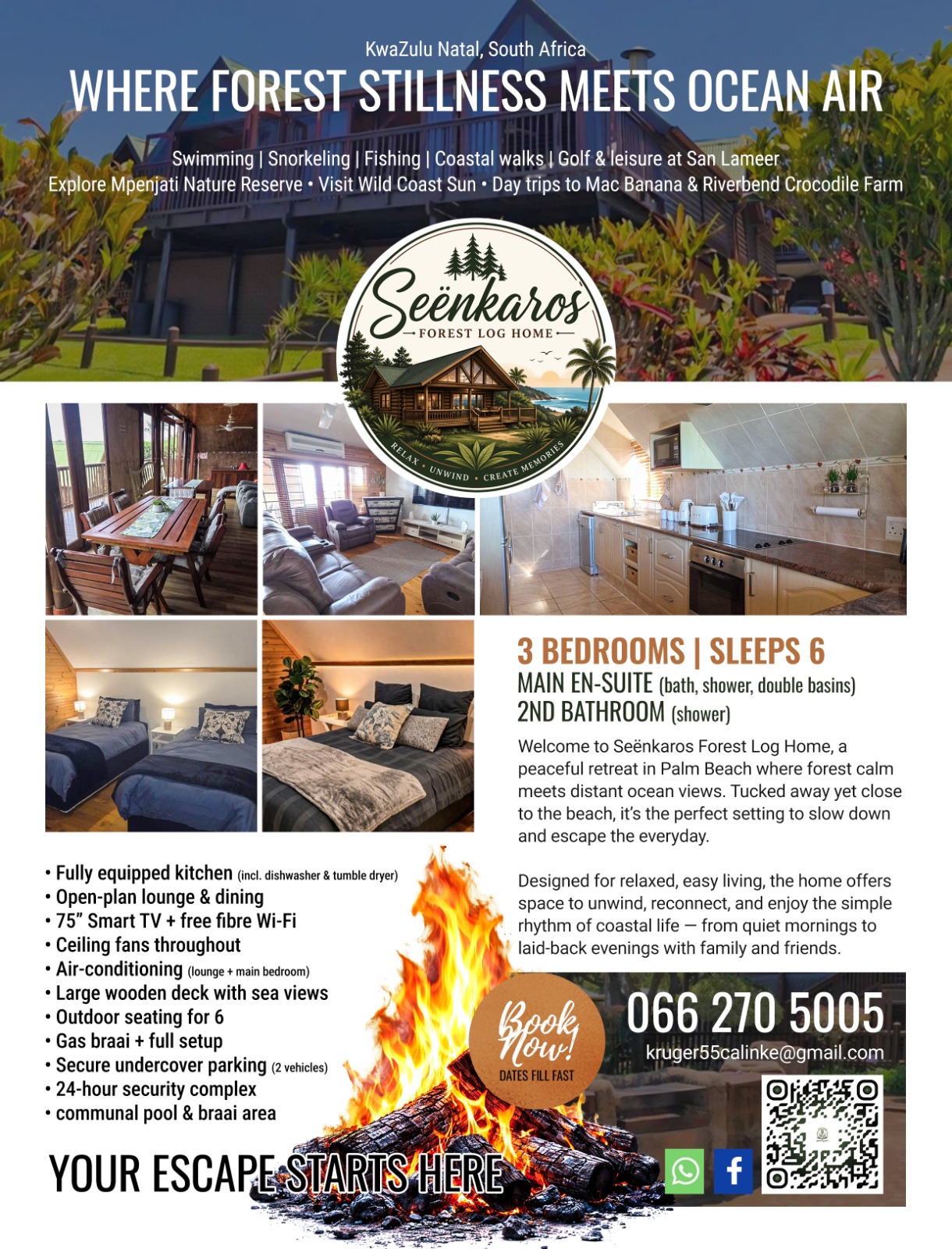 Welcome to Seënkaros, a peaceful forest log home nestled in the quiet coastal village of Palm Beach, KwaZulu-Natal.