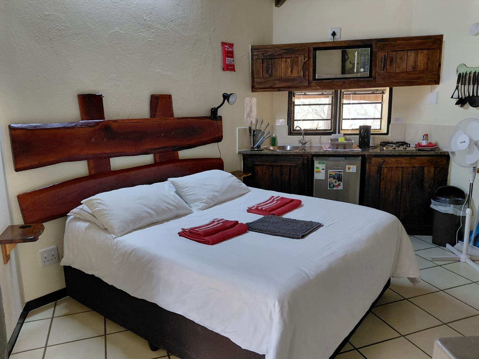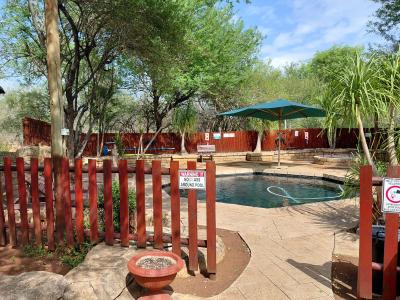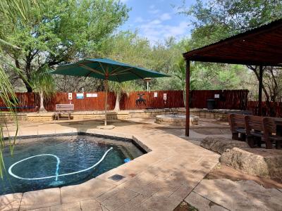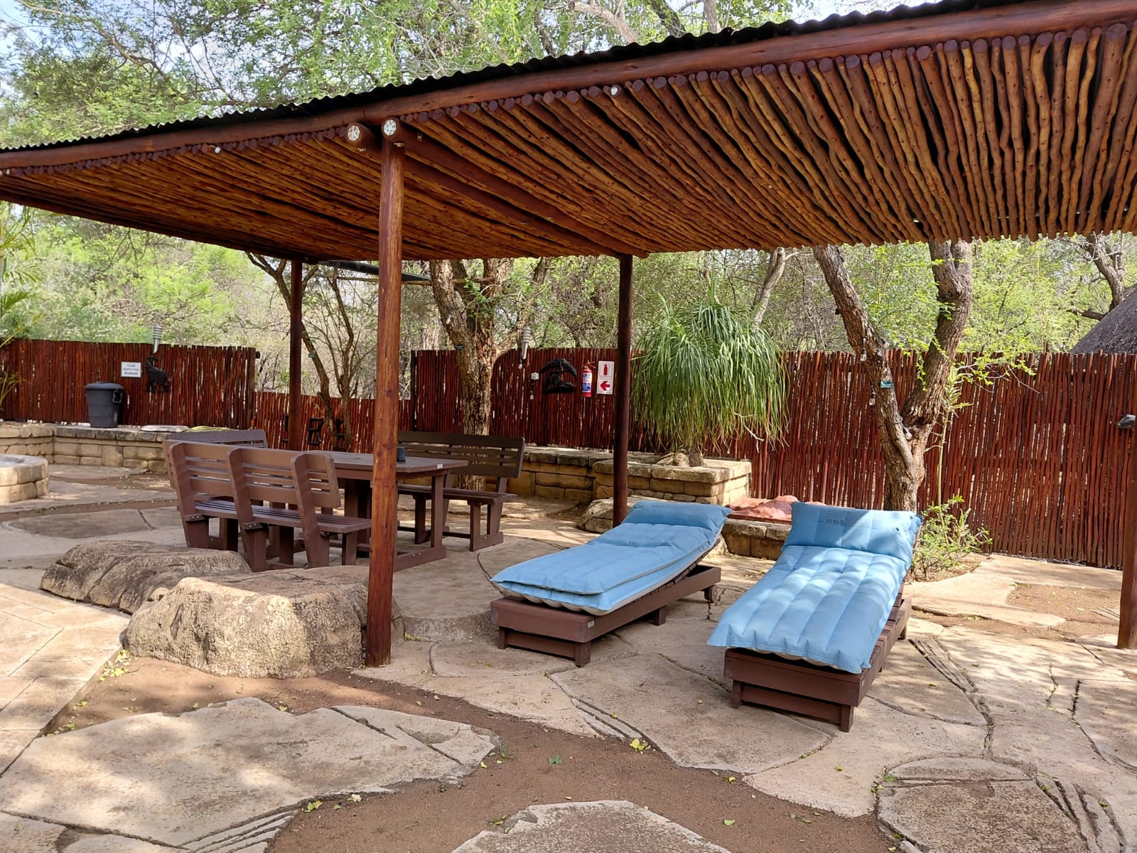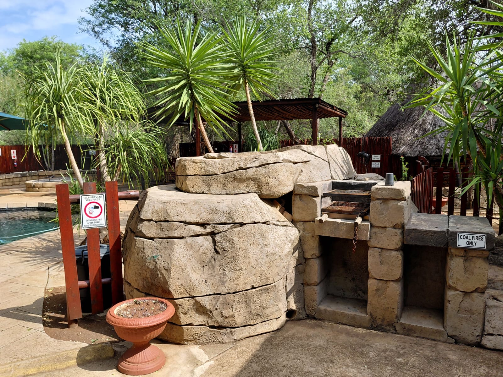 Each chalet is fully equipped for self- catering and offers a braai area to enjoy a rustic dinner or the primeval joy of enjoying a drink with your loved one while sitting around the flickering flames of a campfire. We have an inverter to combat loadshedding and borehole water, offering the bushveld experience while ensuring that you have the modern luxuries of uninterrupted aircon, hot water, and Wi-Fi. Join us at the boma fire on a chilly night or enjoy the communal pool with martini seats to refresh after a hot day. Relax on a lounger in a shady spot with a book or enjoy the warm sunshine and then take a plunge in the pool or watch the animals at the waterhole.