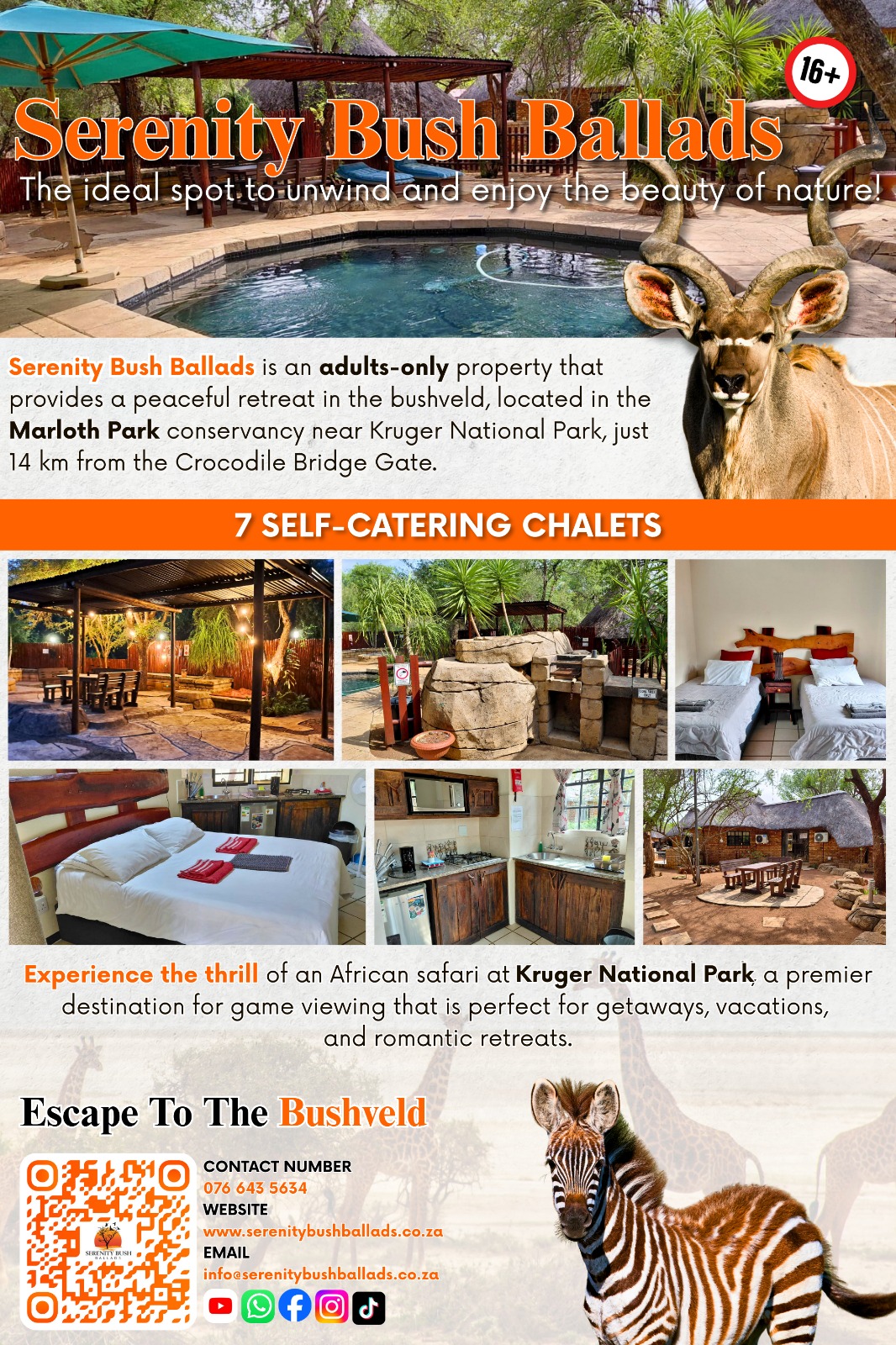 Serenity Bush Ballads offers you one of the few adults only properties where you can soak up the peace and quiet of the bushveld and nature while experiencing the unique coexistence of this stunning conservancy known as Marloth Park which borders the Kruger National Park and is located only 14 km from the Crocodile Bridge Gate.