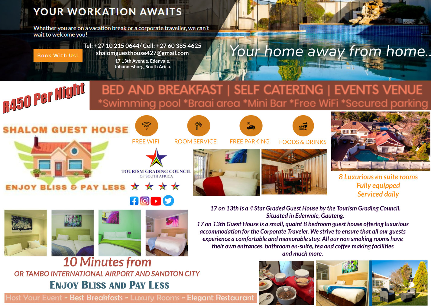 Shalom Guest House is a 4 Star Graded Guest House by the Tourism Grading Council. Situated in Edenvale, Gauteng.