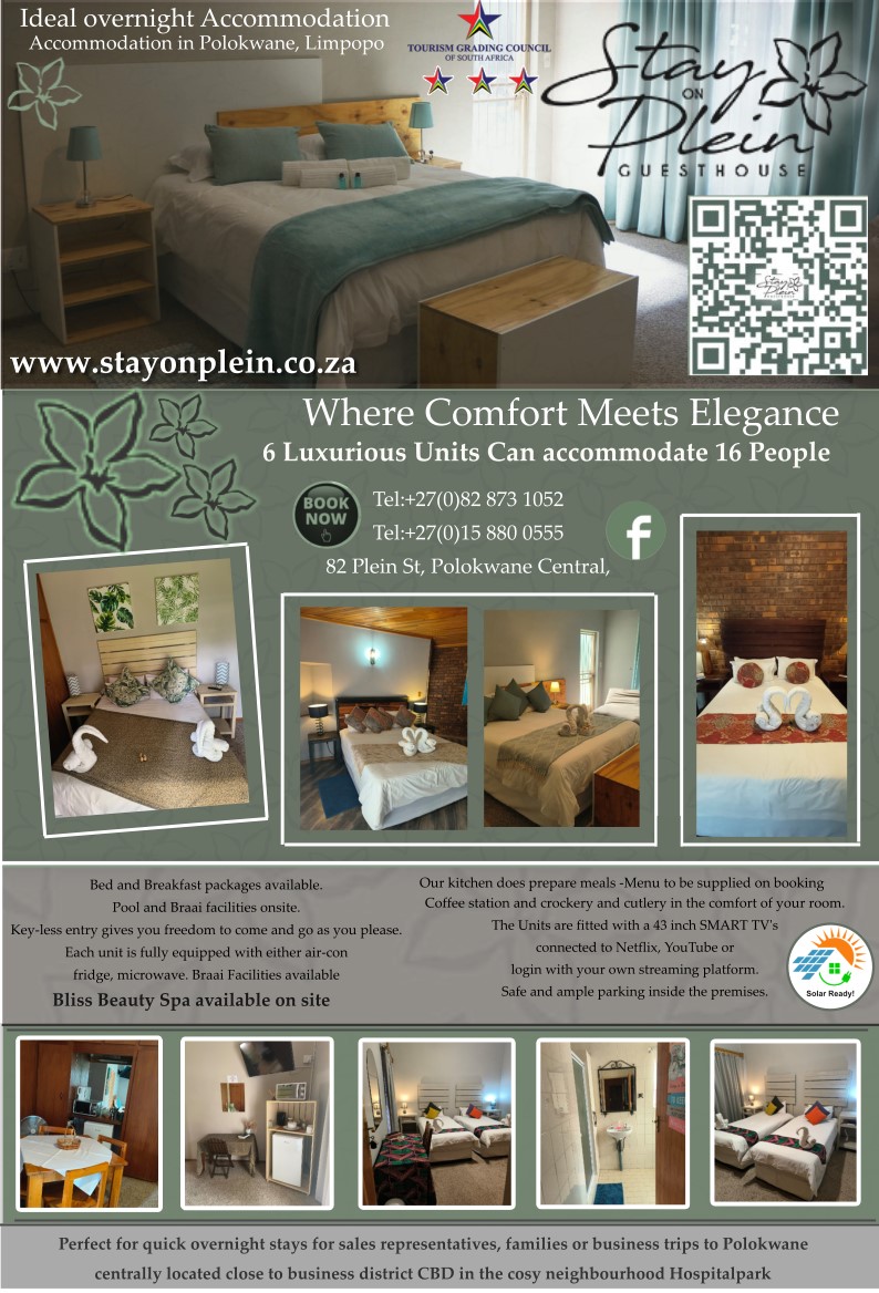 Perfect for quick overnight stays for sales representatives, families or business trips to Polokwane centrally located close to business district CBD in the cozy neighborhood of Moregloed.