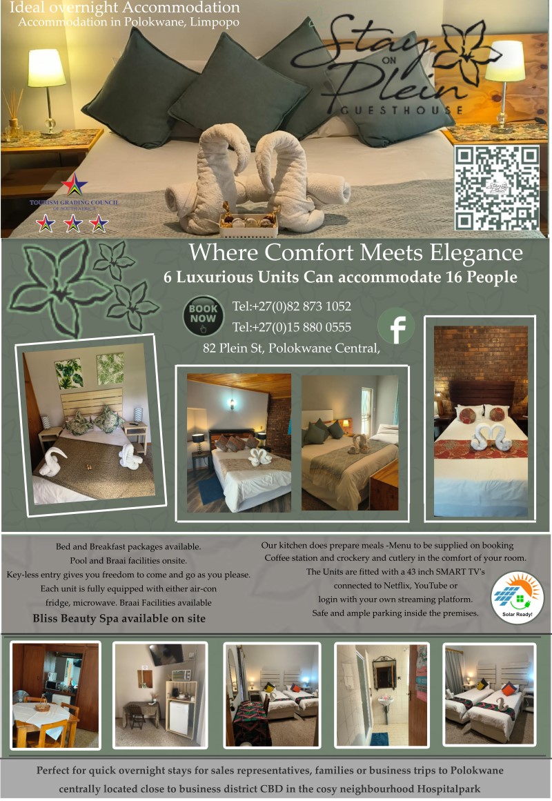 Stay on Plein Guesthouse is located in the medical district of Polokwane, 500 meters from Mediclinic Polokwane.