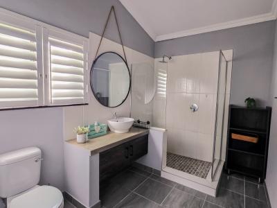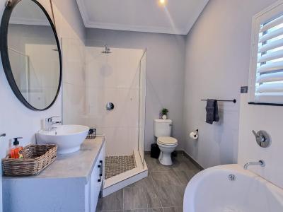 The main bedroom is furnished with a king-size bed and has an en-suite bathroom fitted with a shower, basin, and toilet.