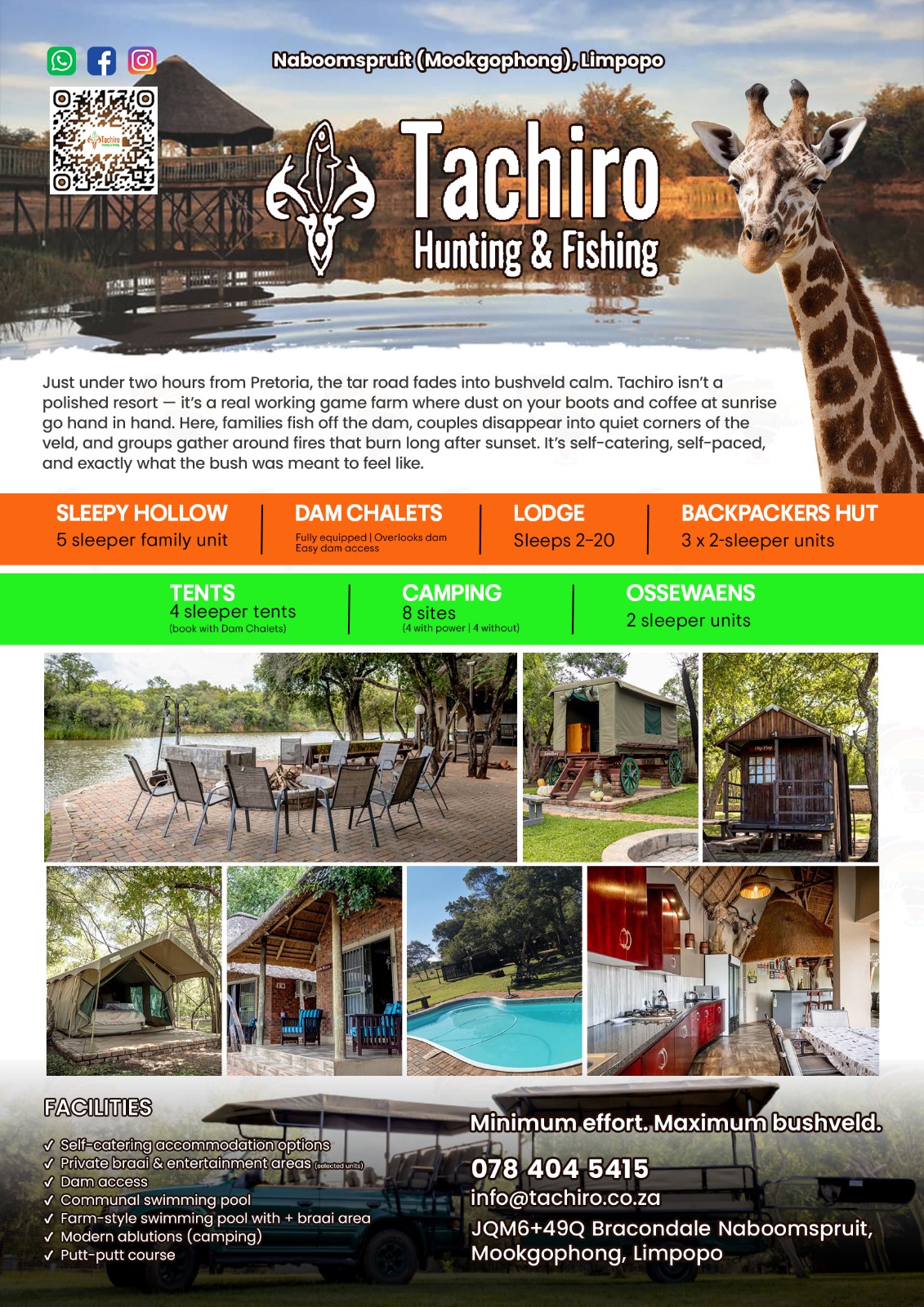 Tachiro Hunting & Fishing Safaris, a Game Farm with a range of different accommodation options to select from and activities to keep everyone occupied, is only 1hr 45 minutes drive from Pretoria in the tranquil, charming and intimate bushveld landscapes of the Mookgophong (Naboomspruit) area.