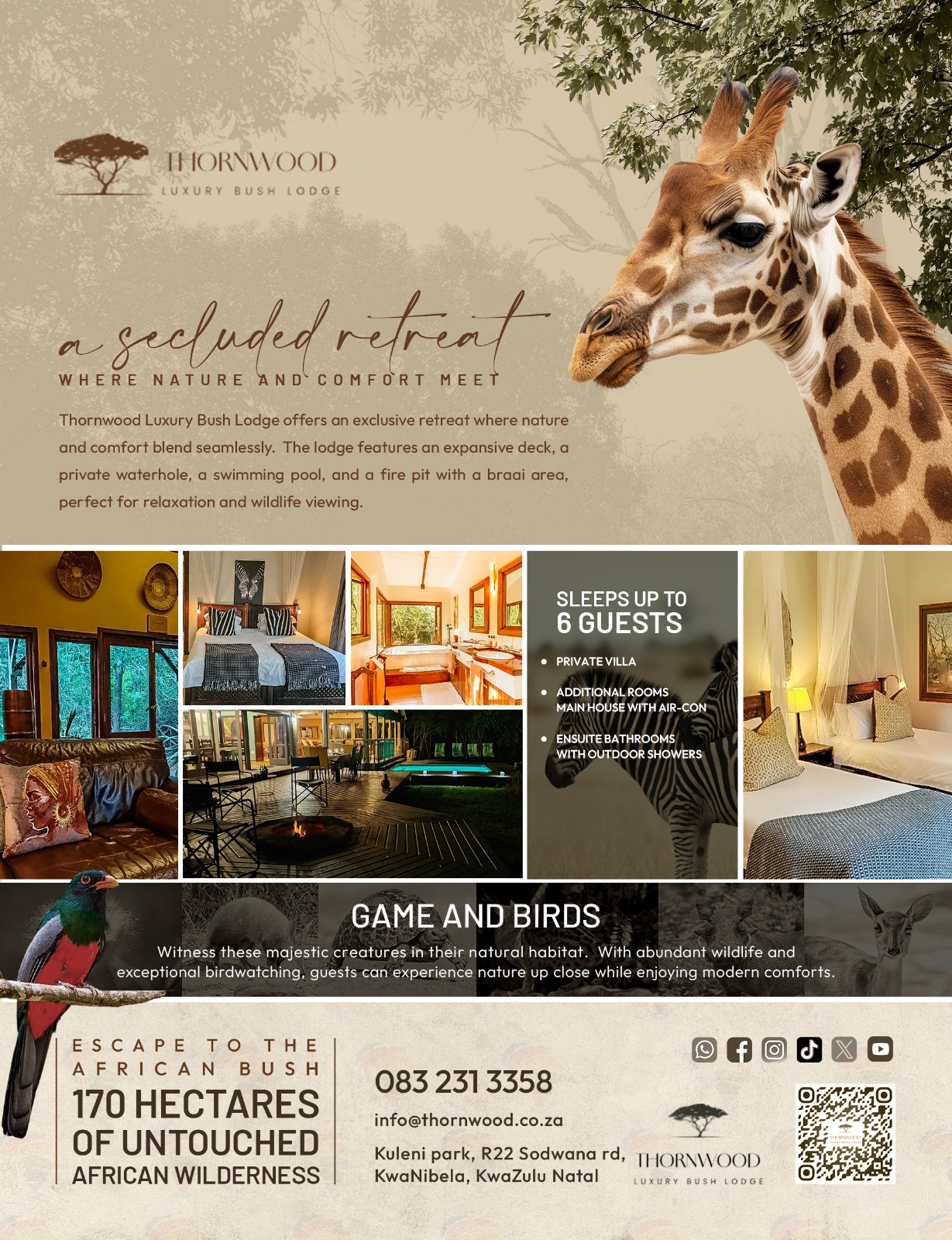 Thorn Wood Lodge is a nature haven, teeming with incredible wildlife, including giraffes, antelope, honey badgers, and porcupines.