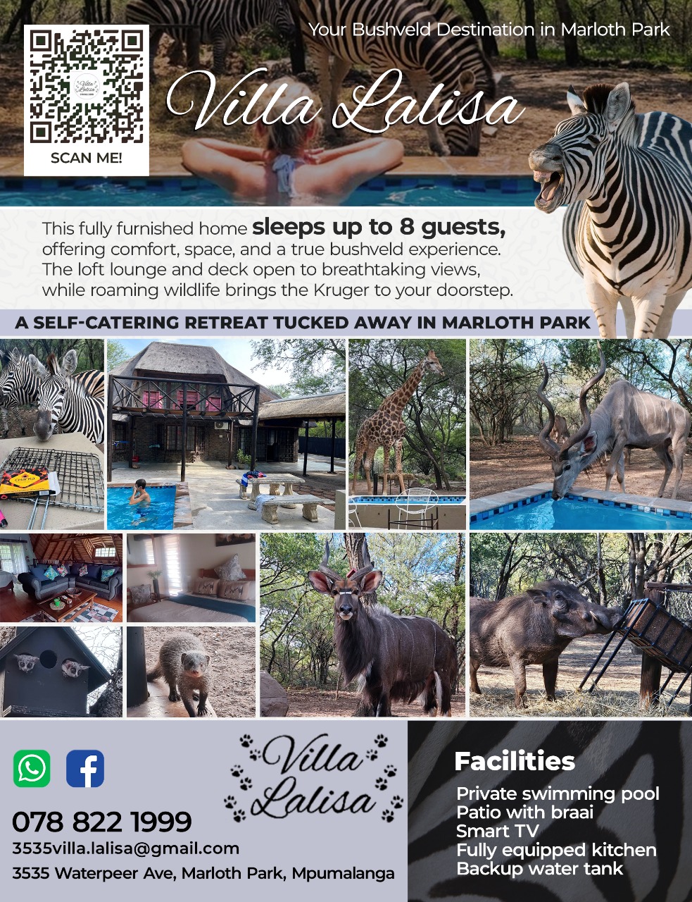 Villa Lalisa is ideally situated 18 km from the Crocodile Bridge Gate at the Kruger National Park, and approximately 102 km from the Kruger Mpumalanga International Airport.