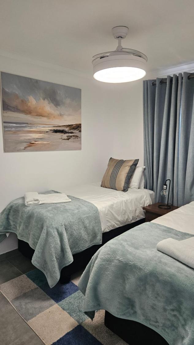 The second bedroom contains a “Queensize” bed, while the third bedroom has 2 single beds.