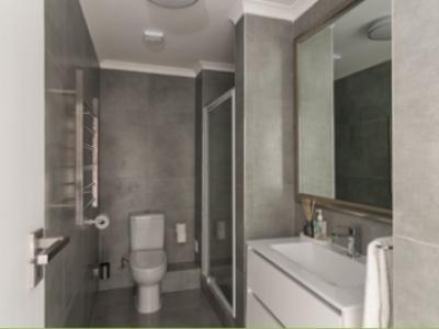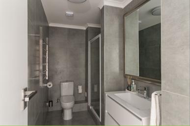 The first bedroom is furnished with a “King size” bed, has a sliding door that opens to the balcony and has an en-suite bathroom with a shower.