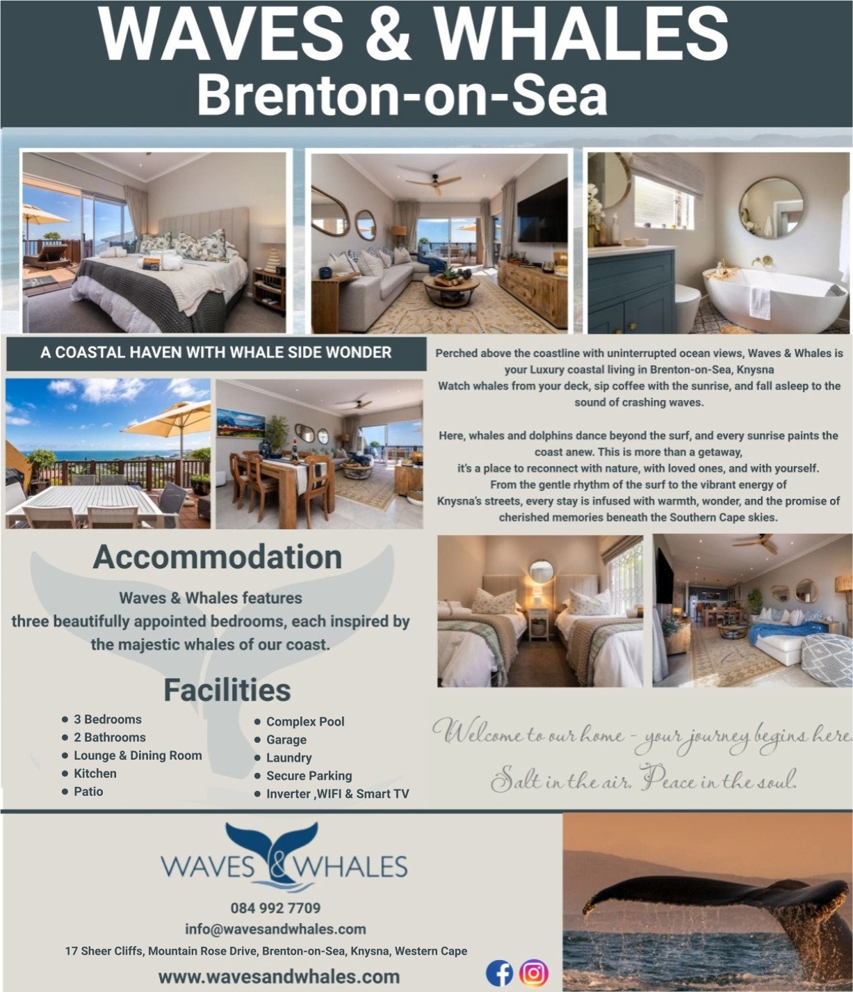 Located near the Brenton Butterfly Reserve and just minutes from pristine beaches, forest hikes, world-class golf courses, and vibrant cultural attractions, Waves & Whales is ideal for families, nature lovers, adventurers, golfers, and digital nomads alike.