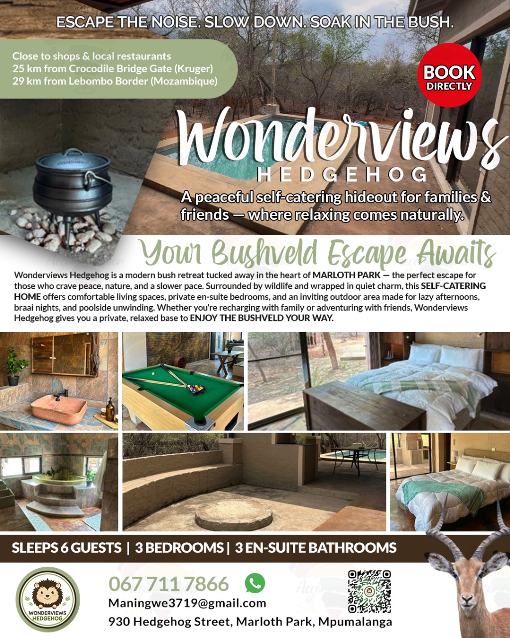 Wonderviews Hedgehog is a lovely self-catering holiday home situated in the popular Marloth Park.